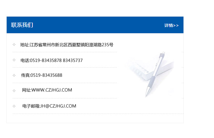 傳真:0519-83435688    郵編:213135    網址:WWW.czjhgj_com.sh-ydy.com    電子郵箱:JH@czjhgj_com.sh-ydy.com
